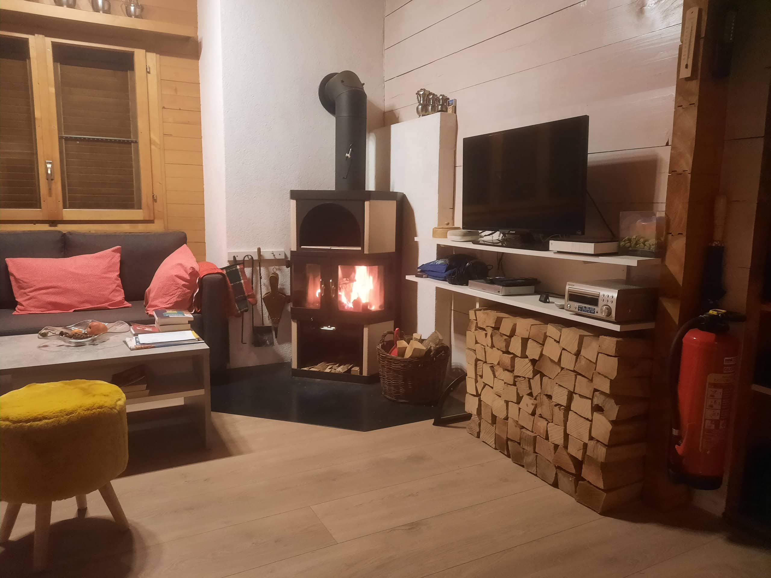 Heizung: Elektro-Speicherheizung im Wohnzimmer, elektrische Direktheizungen in den Zimmern und effizienter Schwedenofen im Wohnzimmer.