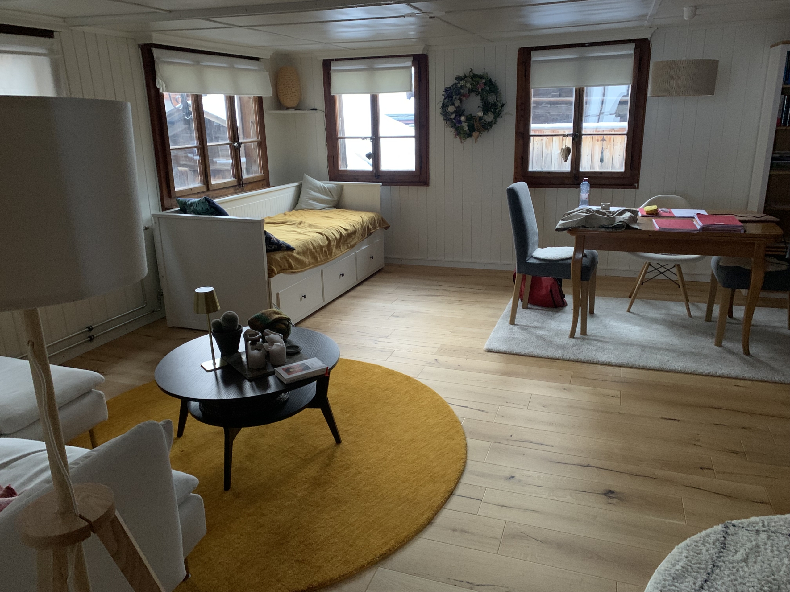Auf Wunsch teilmöbliert und im Preis inbegriffen. Nur Betten, Esstisch, Stühle und Regale fehlen.